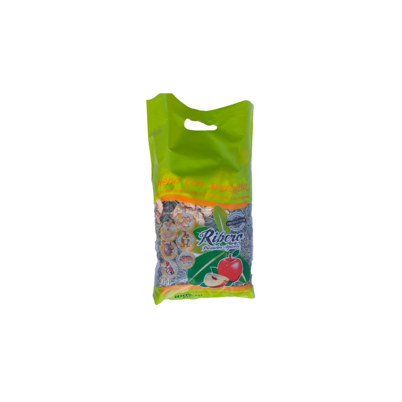 Alimento complementario compuesto por heno de festuca (Festuca Arundinacea) y manzana seleccionados de primera calidad. Heno secado al sol, no deshidratado, con lo que se evita la destrucción de proteína conservando todo el olor y gusto natural del heno.