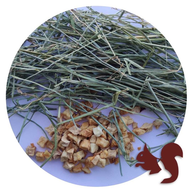 Además de las propiedades que aporta nuestro heno de Festuca de alta calidad secado de forma natural, la manzana aporta vitamina B y C a la dieta de la mascota, y antioxidantes, retrasando el envejecimiento celular.