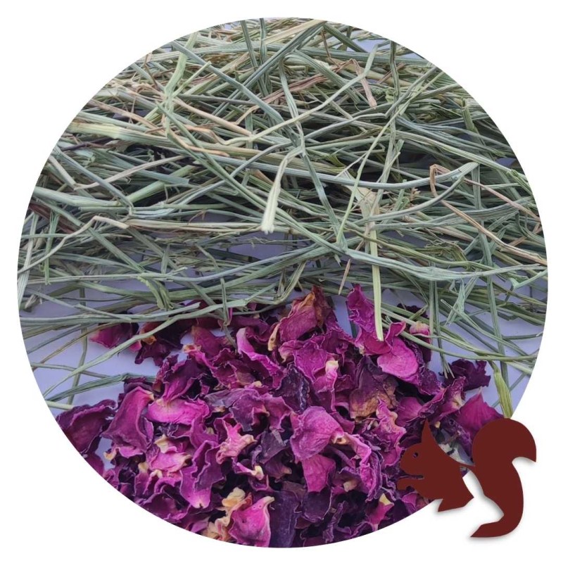 Además de las propiedades que aporta nuestro heno de Festuca de alta calidad secado de forma natural, los pétalos de rosa aportan un sabor y aroma único que contentará a las mascotas más exigentes.