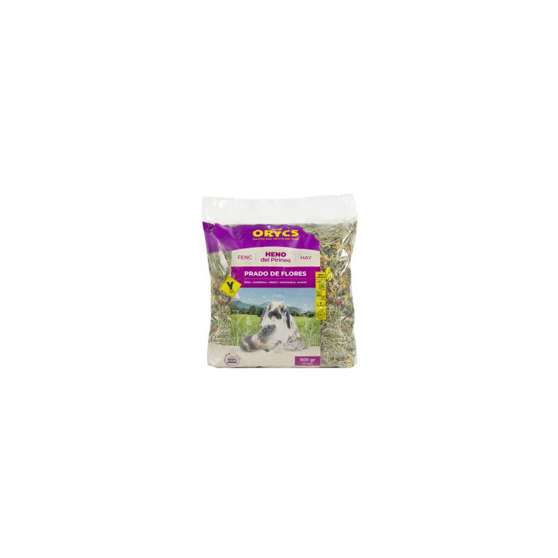 Heno del Pirineo con pétalos de rosa, muy útiles para mejorar el tránsito intestinal. También actúan como antioxidante y relajante. Y diente de león que contribuye a tener unos huesos saludables y un pelaje suave y brillante gracias a su contenido en hierro, ácido fólico y vitamina A y C.