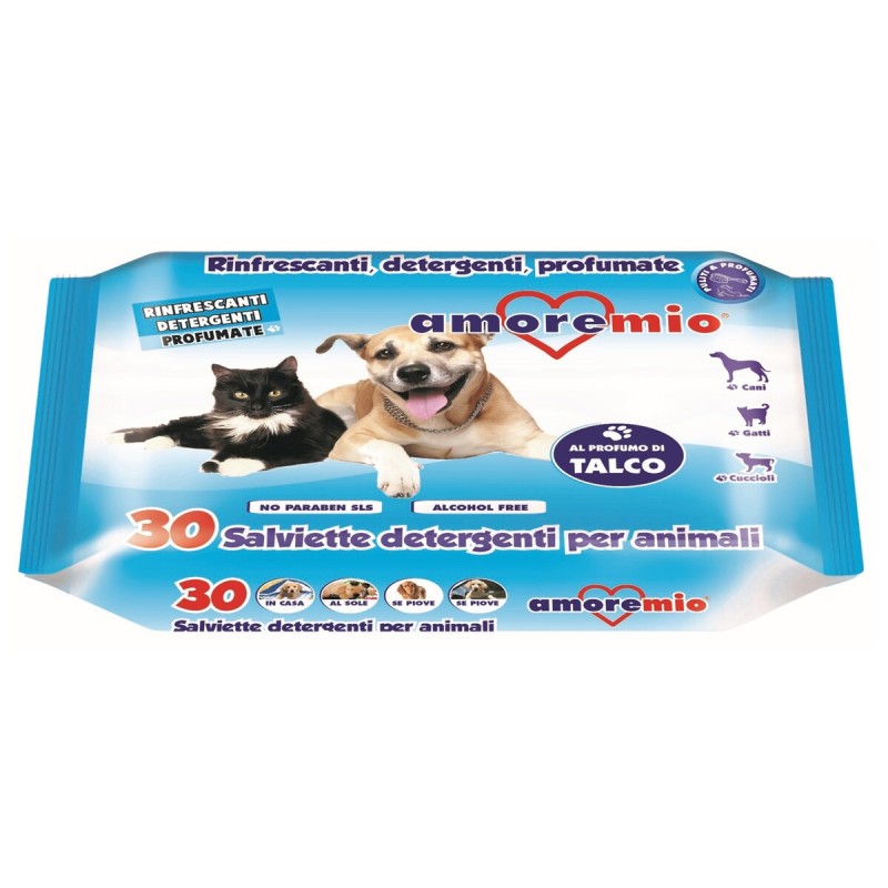 Toallitas húmedas refrescantes con aroma a talco, empapadas en una solución especial, ideal para eliminar el polvo, las secreciones y las impurezas sin crear irritaciones ni rojeces durante su uso | Están enriquecidas con extractos de camomila y son adecuadas para ojos, orejas y pliegues | Gracias al práctico envase de apertura y cierre y a su tamaño, son ideales para su uso en casa, en los desplazamientos o en el campo | Formuladas con ingredientes especialmente seleccionados y adecuados para evitar intolerancias | Aptas para perros, gatos y cachorros | Tamaño de la toallita: 19cm x 13cm .