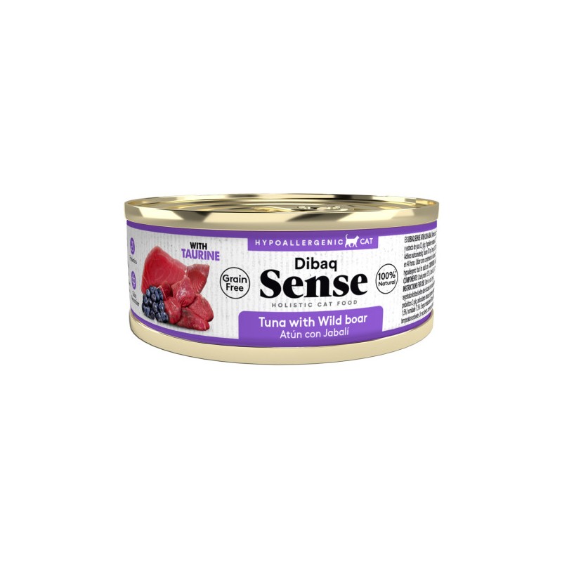 Dibaq Sense Cat Latita Grain Free de Atún con jabalí para gatos es una receta hipoalergénica y sin cereales elaborada con ingredientes 100% naturales. carnes frescas de atún y jabalí, arándanos, prebióticos, extracto de yuca para neutralizar olores.