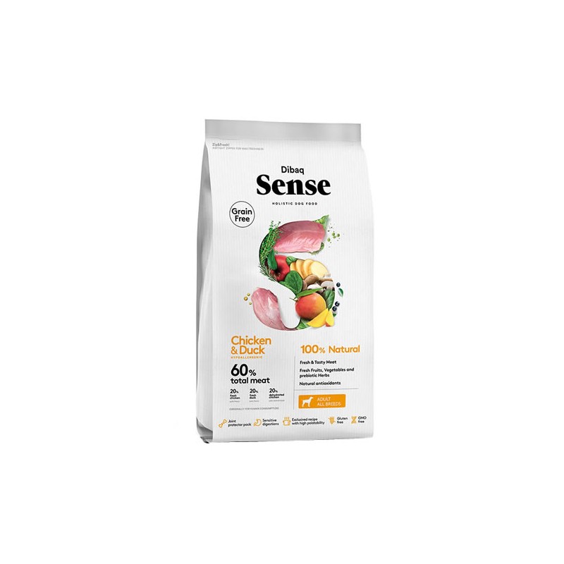 Carne fresca de pollo 20%, carne fresca de pato 20%, carne deshidratada de pollo 20%, guisantes pelados, patata, aceite de pollo, pulpa de remolacha, proteína deshidratada de pollo, hidrolizado de hígado de pollo, verduras y frutas frescas 4% (champiñones, arándanos, mango y manzana), ceratonia siliqua, aceite de salmón (fuente de ácidos grasos omega 3 y 6), sustancias minerales, condroitina sulfato, glucosamina, MSM, yuca, raíz de achicoria (fuente de inulina-FOS), levaduras (MOS) y plantas aromáticas (romero, tomillo y orégano).