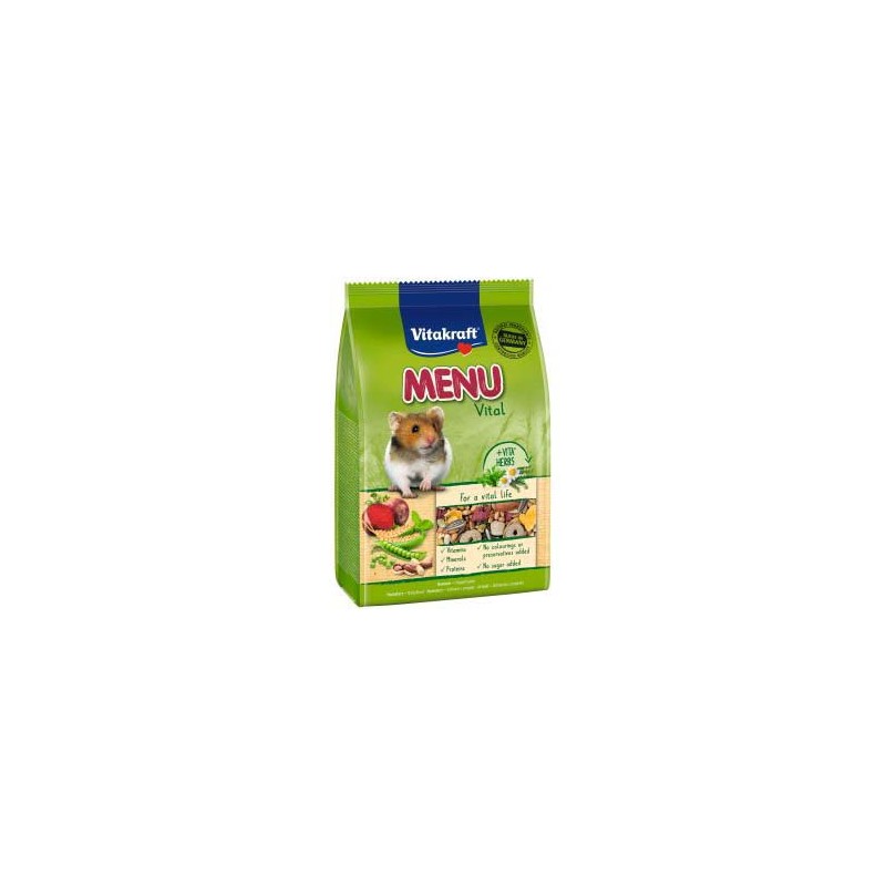 Alimento completo diario para hámsters, a base de semillas, frutos secos y vegetales. Rico en vitaminas, proteínas y sustancias minerales.Contiene vitaminas A, B1, B2, D3 y E esenciales para la salud del hámster,asi como proteínas animales.