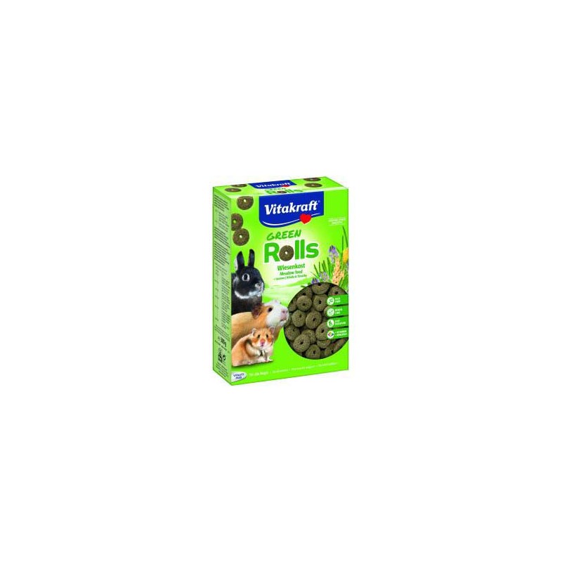 Sabrosos anillos crujientes de puros ingredientes vegetales , bajos en calcio y de fácil digestión . La fibra bruta favorece la abrasión dental y la digestión . Con valiosas vitaminas y minerales ; incluida una porción extra de vitamina C . Recomendación de uso : sustituya 1/4 del alimento principal con Green Rolls . también se puede usar como aperitivo entre comidas .