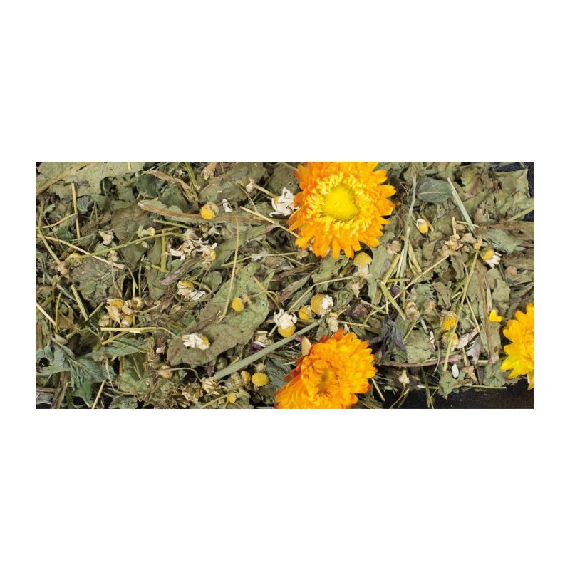Alimento complementario para roedores y conejos enanos. El sabroso diente de león suavemente secado en combinación con la manzanilla es muy relajante para todos los animales pequeños.