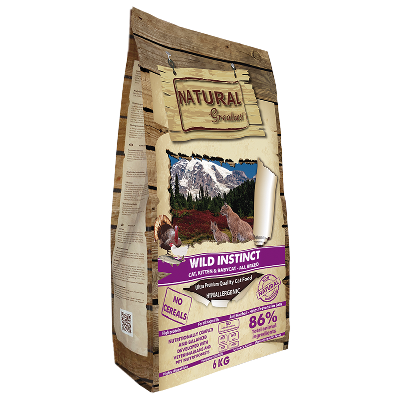 Natural Greatness es una excelente receta ultra premium e hipoalergénica formulada sin cereales y desarrolla idealmente para satisfacer las necesidades nutricionales de gatitos ( a partir de 1 mes de vida ) , gatas gestantes y gatos adultos. Esta receta favorece el tránsito digestivo e incorpora extracto de malta para prevenir la formación de bolas de pelo en el estomago del gato . Este alimento a sido elaborado con altos porcentajes cárnicos , bajo en carbohidratos y con niveles óptimos de taurina para garantizar la buena salud del gato .