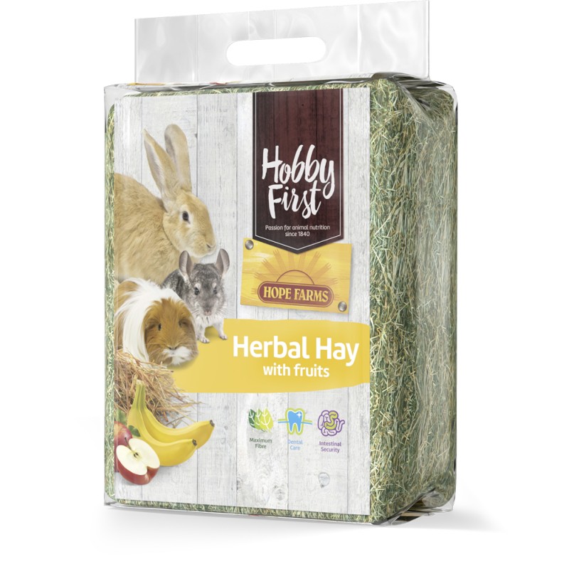 El Heno de Hierbas con Frutas (manzana y plátano) es un excelente forraje de alta calidad para conejos y roedores. Contiene hierbas aromáticas y ha sido cuidadosamente cosechada y secada. El alto contenido en fibra favorece una buena digestión. A los conejos y roedores les gusta. Morder es bueno para los dientes.