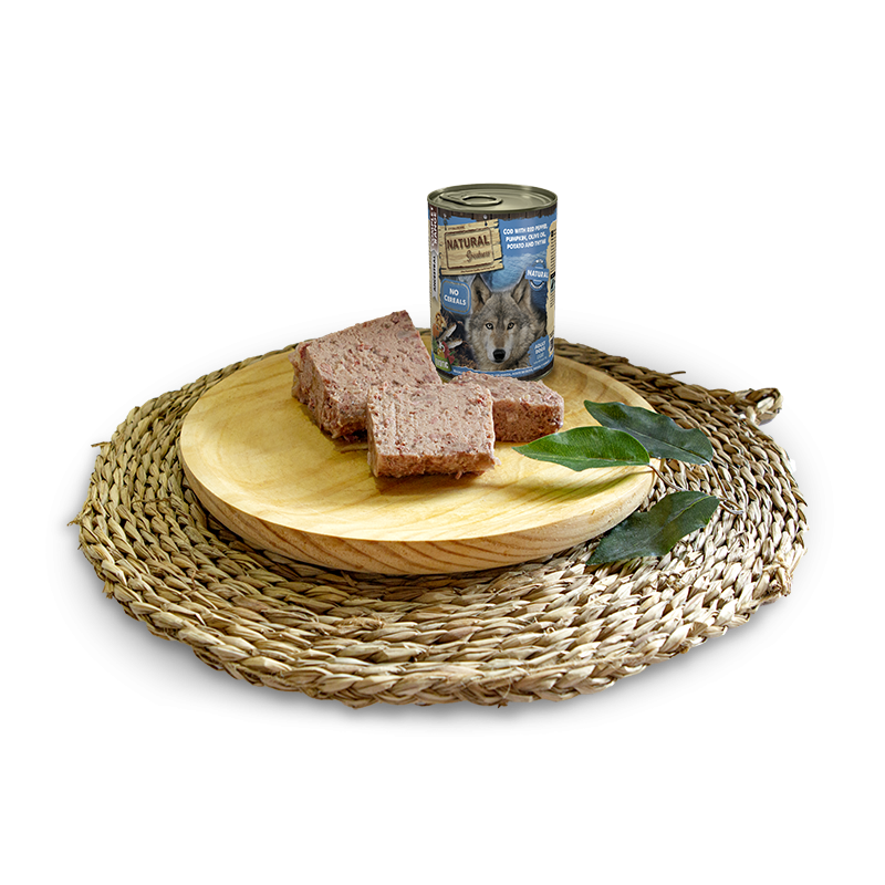 Natural greatness BACALAO CON PIMIENTO ROJO , CALABAZA , ACEITE DE OLIVA , PATATA Y TOMILLO es una excelente receta húmeda completa , ultra premium hipoalérgica , formulada sin cereales y desarrollada para perros adultos. Es una receta monoproteica considerada ULTRA LIGHT gracias a sus aportes de carne de bacalao como única fuente de proteina animal , una carne baja en grasa y de proteínas novel , indicada para perros con intolerancias o alergias a otras carnes más comunes y que deseen mantener un peso ideal , con una dieta baja en carbohidratos . Además, la receta cuenta con la inclusión de superalimentos tales como el pimiento rojo , la calabaza , el aceite de oliva, la patata y el tomillo , los cuales aportan fibra natural y son fuente de vitaminas y minerales y carbohidratos saludables .