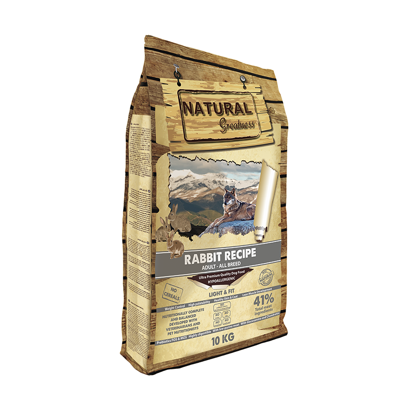 Natural greatness RECETA DE CONEJO es una excelente receta ultra premium , monoproteica e hipoalergénica formulada sin cereales y desarrollada idealmente para perros adultos , adultos esterilizados o senior con tendencia al sobrepeso. Esta receta combina fibras naturales , que contribuyen a que el perro experimente una sensación de saciedad , ayudándolo así a controlar su ingesta calórica de manera efectiva . Además , la fórmula contiene conejo , una carne baja en grasa de alta calidad ,y está enriquecida con glucosamina y condroitina , dos compuestos esenciales para mantener la salud de las articulaciones . También incorpora L-Carnitina , lo que la convierte en una elección ideal tanto para ayudar al perro a quemar grasa como para fortalecer su masa muscular .