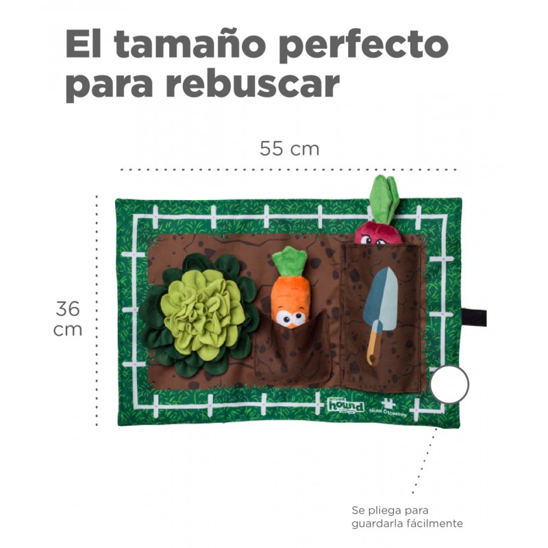 La alfombra de actividades Jardín viene con cierres opcionales para subir de nivel el desafío. Una vez que su perro haya olfateado las golosinas o las croquetas del material de felpa, aumente el desafío colocando comida en los bolsillos y escondiéndolas debajo de una capa adicional. Para un desafío aún más difícil, esconde las deliciosas recompensas debajo de los cierres de gancho y bucle. Cuando no está en uso, la alfombra de actividades se pliega para un fácil almacenamiento.