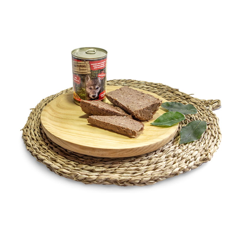 Natural greatness pollo con zanahorias , piña , semillas de lino y arándanos rojos es una excelente receta húmeda completa , ultra premium e hipoalergénica , formulada sin cereales y desarrollada idealmente para cachorros a partir del destete. Este alimento incorpora carne de pollo de alta calidad como única fuente de proteína animal , proporcionando todos los nutrientes necesarios para respaldar un buen desarrollo físico , cognitivo y neuronal del cachorro . Además, la receta cuenta con la inclusión de super alimentos tales como zanahorias , piña , semillas de lino y arándanos rojos , fuentes naturales de fibra , vitaminas , antioxidantes y carbohidratos saludables .