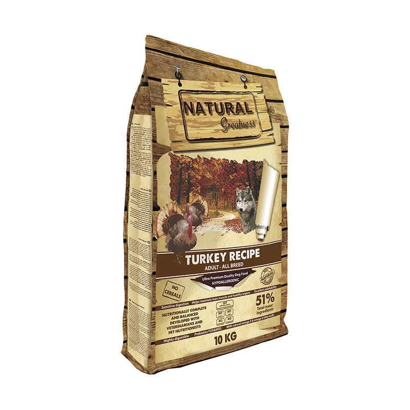Natural greatness RECETA DE PAVO es una excelente receta ultra premium e hipoalergénica formulada sin cereales que dejará satisfechos a perros adultos de todas las razas con digestiones sensibles .Nuestra carne de pavo , con altos niveles de proteína de calidad , garantiza un correcto desarrollo muscular y una notable mejora en el sistema inmunitario del perro. Toda nuestra alimentación se elabora siguiendo un proceso natural de cocción altamente avanzado que se basa en la inyección directa de carne fresca . La calidad de los ingredientes naturales empleados en nuestras recetas les aporta altos niveles de palatabilidad y digestibilidad .