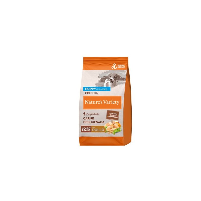 Nature`s Variety Healthy Grains puppy mini pollo es un alimento seco equilibrado especialmente formulado para cachorros de razas pequeñas de 2 a 12 meses. Con una receta rica en carne de pollo deshuesada, arroz integral , avena e ingredientes vegetales seleccionados , proporciona todos los nutrientes esenciales que tu pequeño necesita para un buen comienzo en la vida. Este pienso está diseñado para contribuir al desarrollo normal de los dientes , huesos , visión , cerebro e inmunidad, gracias a su combinación especial de vitaminas y minerales.