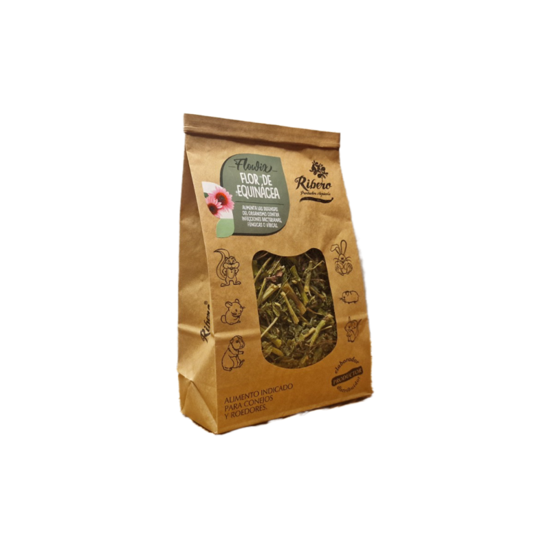 Enriquece la dieta de tus conejos y roedores con la flor de equinácea ribero , un suplemento 100 % natural y libre de pesticidas. Este suplemento añade variedad y sabor a su alimentación diaria mientras aumenta las defensas del organismo contra infecciones , previene resfriados y la astenia primaveral , tiene propiedades antiinflamatorias , estimula el apetito y mejora la digestión . Rica en proteínas y fibra , promueve la salud general de tus mascotas.