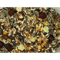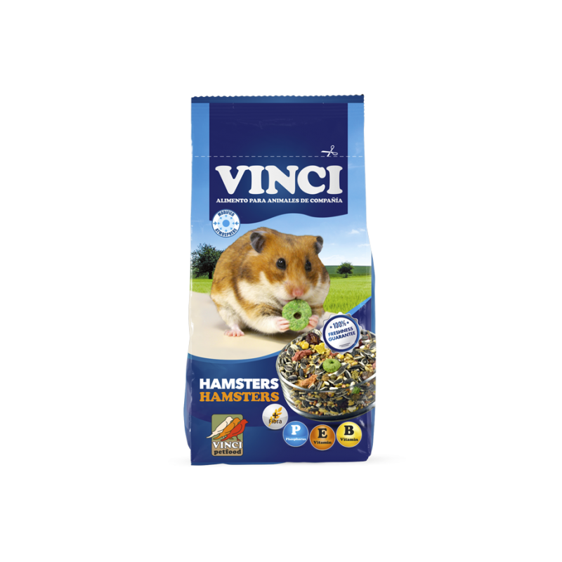 Mezcla equilibrada para hámster compuesta de : semilla de girasol , maíz , semilla de cártamo , trigo , sorgo , vezas, cebada , avena descascarada , productos de panadería y de fabricación de pastas alimenticias , copos de guisantes , fosfato monocálcico , cloruro sódico , aceite y grasa vegetal y aceite mineral. Aditivos: mezcla de aromatizantes.
